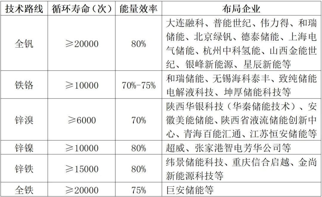 表1 液流電池不同技術路線及布局企業