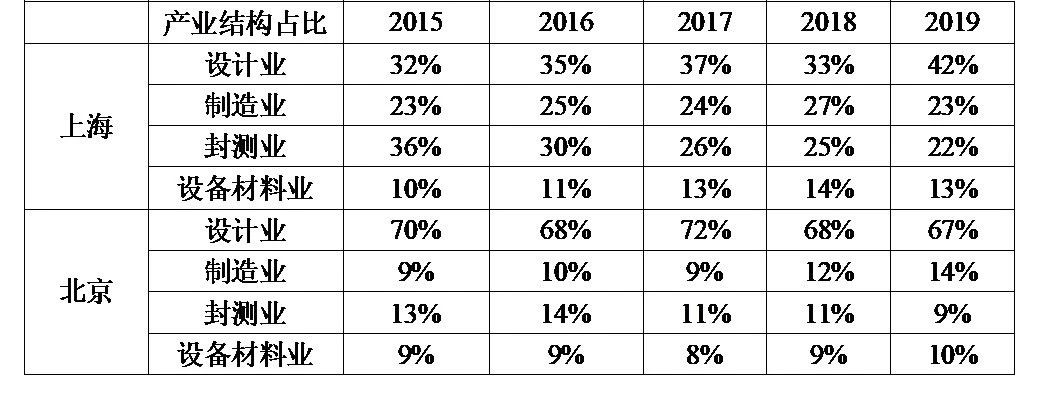 (2)產業結構比較。從產業結構來看,如表2所示,上海市集成電路產業機構更為優化和均衡。相比于2015年,上海集成電路設計業占比從32%提升到42%,強化了引領作用。而封測業從36%下降到22%,制造業和設備材料業占比保持相對穩定,可以看出整體產業結構的演進是在逐步完善的。而北京的產業結構相比之下略顯失衡,設計業從2015年占據70%下降到2019年的67%,而制造、封測、設備材料業均在10%左右,說明北京仍然面臨著產業各環節發展不均衡,具有明顯產業短板的問題。