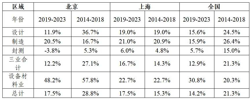 表2 2014-2018年和2019-2023年兩個五年全國、北京、上海的集成電路產業規模增速對比