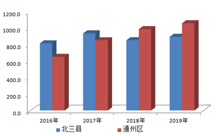 圖1 2016年-2019年北三縣和通州區(qū)地區(qū)生產總值比較(單位:億元)