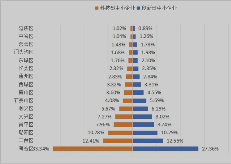 圖1 北京市科技型中小企業(yè)和創(chuàng)新型中小企業(yè)區(qū)域分布 2.兩類企業(yè)培育導(dǎo)向基本一致,創(chuàng)新型中小企業(yè)指標(biāo)體系覆蓋面更廣。 科技型中小企業(yè)和創(chuàng)新型中小企業(yè)的評(píng)價(jià)指標(biāo)均關(guān)注企業(yè)研發(fā)創(chuàng)新活動(dòng)、研發(fā)成果產(chǎn)出情況,在研發(fā)投入、知識(shí)產(chǎn)權(quán)產(chǎn)出上分別設(shè)置計(jì)分指標(biāo)??萍紕?chuàng)新型中小企業(yè)在研發(fā)活動(dòng)上設(shè)置科技人員指標(biāo),考核科技人員占企業(yè)職工總數(shù)的比例,更聚焦于企業(yè)本身在研發(fā)活動(dòng)上的要素投入。創(chuàng)新型中小企業(yè)同時(shí)要考核企業(yè)的成長性和專業(yè)度,對(duì)企業(yè)主營業(yè)務(wù)收入、資產(chǎn)負(fù)債率、主導(dǎo)產(chǎn)品所屬領(lǐng)域和產(chǎn)生收入占比情況設(shè)置計(jì)分指標(biāo)。 這種差異從直通指標(biāo)設(shè)置中也可體現(xiàn),兩類企業(yè)如獲得高級(jí)別科技獎(jiǎng)勵(lì)、擁有其他科技創(chuàng)新類企業(yè)資質(zhì)、成立省部級(jí)研發(fā)機(jī)構(gòu)均可獲得直通資格。不同的是,對(duì)將先進(jìn)技術(shù)轉(zhuǎn)化為標(biāo)準(zhǔn)、在市場(chǎng)形成一定自我保護(hù)壁壘的中小企業(yè)設(shè)置給予科技型中小企業(yè)稱號(hào)“直通車”資格(主導(dǎo)制定過國際標(biāo)準(zhǔn)、國家標(biāo)準(zhǔn)或行業(yè)標(biāo)準(zhǔn)),對(duì)在資本市場(chǎng)獲得了認(rèn)可的、擁有一定資本實(shí)力的中小企業(yè)可獲得創(chuàng)新型中小企業(yè)稱號(hào)“直通車”資格(近三年內(nèi)新增股權(quán)融資總額(合格機(jī)構(gòu)投資者的實(shí)繳額)500萬元以上)。 3.兩類企業(yè)創(chuàng)新目的不同,在創(chuàng)新能力和產(chǎn)業(yè)支撐方面各有側(cè)重。 科技型中小企業(yè)更多考慮處于研發(fā)階段且暫未形成一定經(jīng)濟(jì)收入的企業(yè),如在研發(fā)費(fèi)用投入上設(shè)置二選一靈活指標(biāo),企業(yè)可自行選擇研發(fā)費(fèi)用與銷售收入和成本費(fèi)用支出相比較取得優(yōu)勢(shì)指標(biāo)。在科研人員上的關(guān)注同樣體現(xiàn)出科技型中小企業(yè)對(duì)研發(fā)投入上的傾斜,不僅要求企業(yè)投入更多的研發(fā)資金,在科研人員力量配備上也同步提出要求并作為門檻條件(科技人員指標(biāo)得分不得為0分)的強(qiáng)制要求,體現(xiàn)科技型中小企業(yè)的研發(fā)屬性。創(chuàng)新型中小企業(yè)僅設(shè)置了研發(fā)費(fèi)占營業(yè)收入比例這一個(gè)選項(xiàng)。 在科技創(chuàng)新成果產(chǎn)出方面,對(duì)于企業(yè)獲得知識(shí)產(chǎn)權(quán)情況,科技型中小企業(yè)根據(jù)獲得Ⅱ類知識(shí)產(chǎn)權(quán)數(shù)據(jù)可在此項(xiàng)指標(biāo)中得到20%—80%的分?jǐn)?shù),1項(xiàng)I類知識(shí)產(chǎn)權(quán)即可獲得滿分,對(duì)處于研發(fā)期的中小企業(yè)更加友好,而創(chuàng)新型中小企業(yè)如僅Ⅱ類知識(shí)產(chǎn)權(quán),僅可獲得12.5%的分?jǐn)?shù),無關(guān)數(shù)量,想取得更高分?jǐn)?shù)需要獲得更高價(jià)值專利,如高價(jià)值I類專利或者自主研發(fā)的I類知識(shí)產(chǎn)權(quán)。同時(shí)認(rèn)定企業(yè)所屬產(chǎn)業(yè)為新一代信息技術(shù)、生物、高端裝備制造、新能源、新材料等戰(zhàn)略新興產(chǎn)業(yè)且已初具規(guī)模形成較好的經(jīng)濟(jì)收益,對(duì)企業(yè)能否支撐產(chǎn)業(yè)發(fā)展有更高的要求。 4.兩類企業(yè)培育路徑均呈“階梯型”,主管部門職責(zé)不同影響資源配置效率和效果。 創(chuàng)新型中小企業(yè)是工業(yè)和信息化部優(yōu)質(zhì)中小企業(yè)梯度培育的第一級(jí),也是企業(yè)走“專精特新”之路的第一步,企業(yè)資質(zhì)認(rèn)定后即正式進(jìn)入梯度培育體系,沿著“創(chuàng)新型中小企業(yè)—專精特新企業(yè)—國家小巨人企業(yè)-隱形冠軍/單項(xiàng)冠軍”道路發(fā)展??萍夹椭行∑髽I(yè)同樣可看作科學(xué)技術(shù)部的對(duì)于科技型企業(yè)培育工作的第一級(jí),企業(yè)按照“科技型中小企業(yè)—高新企業(yè)—獨(dú)角獸企業(yè)”階梯向上發(fā)展。 根據(jù)現(xiàn)有政策和培育體系,兩者在“攀爬”階梯過程中,每升一級(jí)都可獲得更加精準(zhǔn)、適合和力度更強(qiáng)的發(fā)展支撐,通過分析近年來針對(duì)兩類企業(yè)出臺(tái)的政策,在知識(shí)產(chǎn)權(quán)、人才引進(jìn)、研發(fā)及成果轉(zhuǎn)化、數(shù)智轉(zhuǎn)型和金融支持上均有支持,對(duì)于能提供培育資源的載體,如孵化器之于科技型中小企業(yè),示范平臺(tái)及示范基地、專精特新工作站、專精特新園區(qū)之于創(chuàng)新型中小企業(yè),均有相關(guān)政策或資金支持??萍夹椭行∑髽I(yè)獨(dú)有的研發(fā)費(fèi)用加計(jì)扣除、延長虧損結(jié)轉(zhuǎn)年限等政策和創(chuàng)新型中小企業(yè)后續(xù)可享受的上市融資、品牌培育、融鏈補(bǔ)鏈等政策的獨(dú)有性,也根據(jù)認(rèn)定主管部門的自身職責(zé)提供政策支持。 5.兩類企業(yè)在產(chǎn)業(yè)鏈融通中均具有重要的支撐作用,但扮演角色和融鏈環(huán)節(jié)不同。 科技型中小企業(yè)