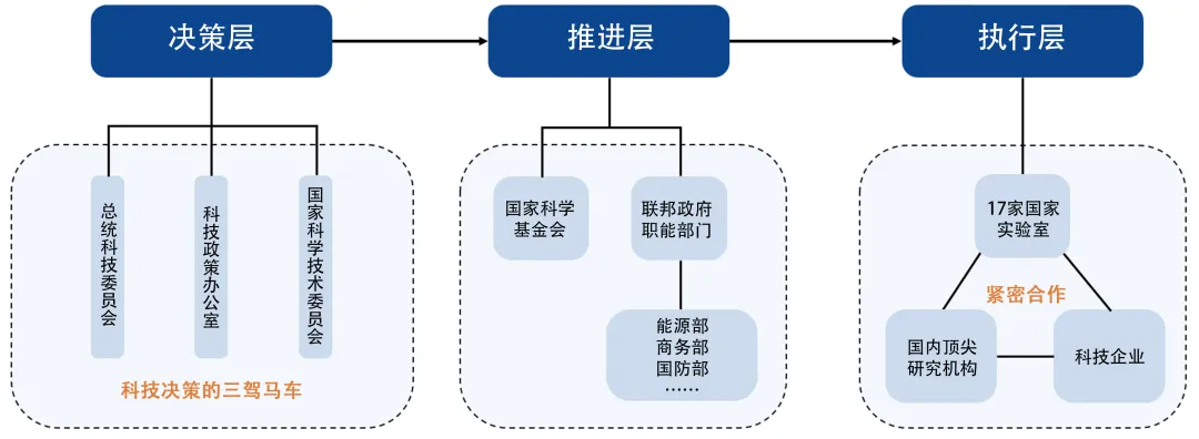 美國(guó)政府及人工智能發(fā)展推進(jìn)機(jī)構(gòu)分為決策層、推進(jìn)層和執(zhí)行層。決策層承擔(dān)提出政策建議、決定政策方向的任務(wù),包括總統(tǒng)科技顧問(wèn)委員會(huì)(PCAST)、科技政策辦公室(OSTP)和國(guó)家科學(xué)技術(shù)委員會(huì)(NSTC),這三個(gè)機(jī)構(gòu)被稱為聯(lián)邦政府科技決策的“三駕馬車(chē)”。推進(jìn)層負(fù)責(zé)落實(shí)政策、推進(jìn)項(xiàng)目,以能源部、商務(wù)部等職能部門(mén)以及美國(guó)國(guó)家科學(xué)基金會(huì)(NSF)為核心。執(zhí)行層主要由能源部管轄的17家國(guó)家實(shí)驗(yàn)室構(gòu)成,將研究資源輸送到人工智能各細(xì)分領(lǐng)域,與頂尖高校等研究機(jī)構(gòu)和前沿科技企業(yè)合作共同開(kāi)展前沿科研工作。