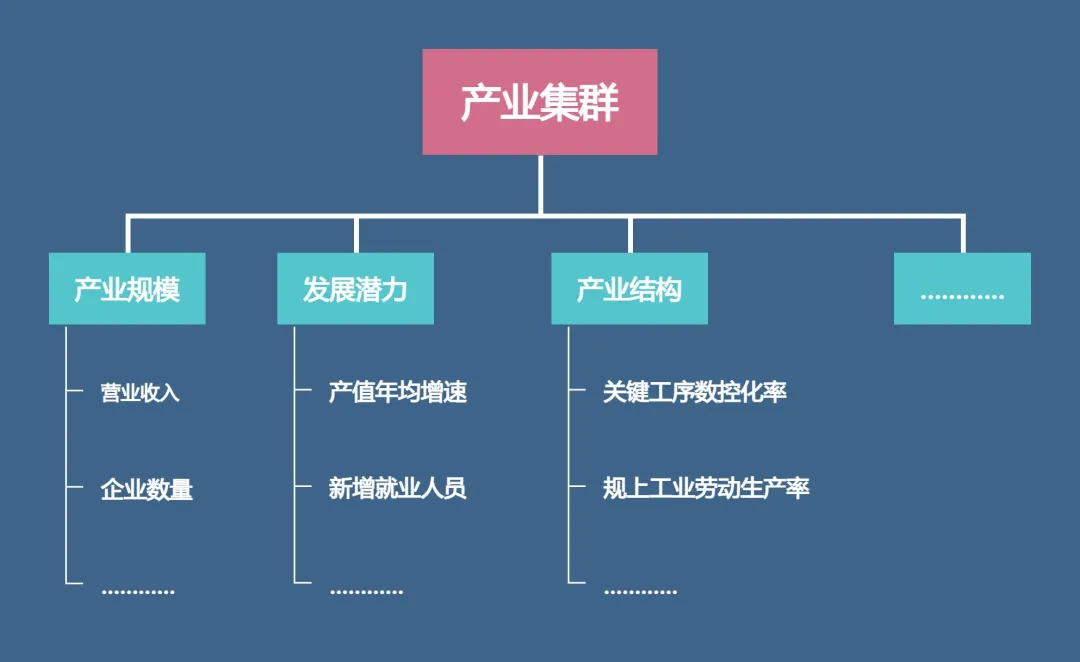 本文揀選一個一級指標下設(shè)若干二三級指標的評估指標體系為示例,三類評估框架體系均可在上述指標基礎(chǔ)上進行靈活調(diào)整。要點式評估體系聚焦核心關(guān)注點調(diào)整一二三級指標,如階段性主要關(guān)注產(chǎn)業(yè)規(guī)模時,可在行文分析時多著墨于產(chǎn)業(yè)營收規(guī)模、企業(yè)數(shù)量等情況,以凸顯成效或問題;賦分式評估體系適當對指標進行權(quán)重賦分,如設(shè)定產(chǎn)業(yè)集群在總體指標體系中權(quán)重為30%,可細化分解權(quán)重為產(chǎn)業(yè)規(guī)模10%、發(fā)展?jié)摿?0%、產(chǎn)業(yè)結(jié)構(gòu)10%,依此類推設(shè)定三級指標權(quán)重;指數(shù)式評估體系可利用指標體系某一維度或總體評分結(jié)果等作為基準值進行綜合測算,如對2020-2023年產(chǎn)業(yè)集群變化情況進行指數(shù)化分析,可先依托賦分式指標體系計算出2020年得分,并將其作為基準值對應(yīng)指數(shù)“1”,2021-2023年得分各自與2020年得分之比乘以“1”,結(jié)果便可作為各年度產(chǎn)業(yè)集群指數(shù)。