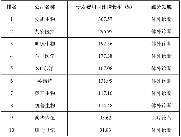 體外診斷行業是醫療器械行業中收入規模、歸母凈利潤規模最大且增速最高的子行業。51家體外診斷上市公司2022年實現營收總額2181.5億元,營業收入同比增長率59.5%,歸母凈利潤同比增速超50%。體外診斷的業績高增長,與國內體外診斷企業抓住呼吸道傳染病在全球持續蔓延的機遇,重點推動新冠抗原檢測、新冠抗體檢測等系列產品在海外市場化推廣,使國外銷售收入激增等密切相關。九安醫療2022年報顯示其涵蓋新冠抗原檢測試劑等產品在內的iHealth系列產品在國內國際市場實現銷售放量,iHealth系列產品銷售收入259.7億元,同比增長1296.3%,占該公司營業收入的比重為98.7%。 醫用耗材行業是醫療器械行業中營收規模最小,凈利潤下滑最明顯的子行業。46家醫用耗材類上市公司2022年實現營收總額944億元,營業收入同比增長率3.3%,歸母凈利潤同比下滑超過50%。可能與醫用耗材行業供應過剩、量價齊跌以及高端耗材集采普及的影響有較大的相關性。英科醫療、中紅醫療、振德醫療在2020年歸母凈利潤同比增長10倍以上,此后受庫存高企、競爭加劇的態勢下供過于求及價格大幅回落等因素影響,過去兩年,英科醫療、中紅醫療、振德醫療的經營業績均出現不同程度的下滑回落。2022年,英科醫療、中紅醫療的歸母凈利潤同比下滑幅度均超過90%,振德醫療2021年歸母凈利潤同比下滑76.6%。高端耗值集采常態化也對醫用耗材企業業績造成顯著影響,大博醫療、凱利泰、威高股份等高值耗材企業業績均在2022年出現明顯下滑。 醫療設備行業是醫療器械行業中營收規模最穩定,受疫情沖擊最小的子行業。40家醫療設備類上市公司2022年實現營收總額1010.7億元,營業收入同比增長7.82%。近三年,醫療設備子行業雖同樣受疫情變化的影響,帶來生命監護類設備需求回落的沖擊,但因分級診療政策下基層醫療機構設備配置需求逐步釋放,整體還是實現了較為穩健的業績增長。2022年,怡和嘉業家用呼吸機的需求量較去年同期均顯著提升,奕瑞科技的齒科、普放、放療類產品均保持穩定增長,山外山的血液凈化設備受國產替代系列政策利好形勢,銷售業績增長較好。 三、研發投入 體外診斷類企業研發費用增速最大。2022年體外診斷類上市公司平均研發費用同比增長53.8%,增速最高的為安旭生物,達到367.6%。平均研發費用占營業收入比例8.73%,其中研發投入強度最高的禾信儀器為27.72%。 醫用耗材類和醫療設備類企業仍是研發投入主力。2022年醫用耗材類上市公司平均研發費用同比增長16.06%,增長比率最高的為奧精醫療,達到72.91%。平均研發費用占營業收入比例9.99%,研發投入強度最高的賽諾醫療為79.22%。2022年醫療設備類上市公司平均研發費用同比增長20.66%,增長比率最高的為澳華內鏡,達到95.62%。平均研發費用占營業收入比例12.32%,研發投入強度最高的天智航為78.52%。 表3 2022年研發費用同比增長率TOP10