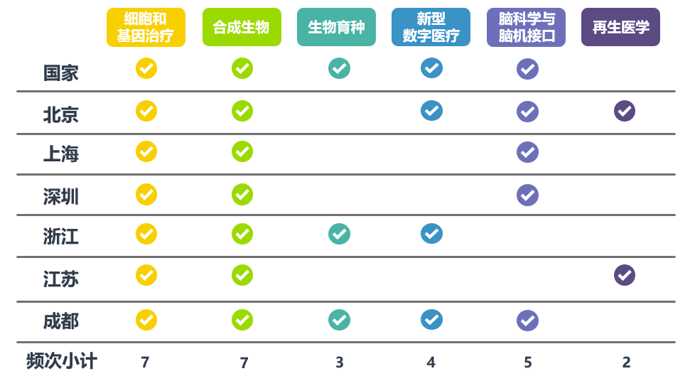 自國家“十四五”規劃綱要提出要前瞻謀劃未來產業以來,各地高度重視并加快未來產業的系統謀劃與前瞻布局。北京、上海、成都、浙江、江蘇等地陸續出臺了相關指導意見、行動方案(詳見附表)。圍繞未來健康產業,均提出了要加快布局細胞與基因治療、合成生物學等領域新賽道。部署重點領域情況如下: