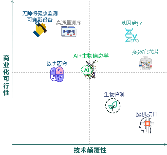 本文從國內外學界、產業界關注度較高、廣泛報道的科技前沿和未來趨勢中,重點選取基因治療、腦機接口、類器官芯片、AI+生物信息學、生物育種等若干代表性方向,從技術概覽、科研或產業化進展、應用領域等方向進行分析。