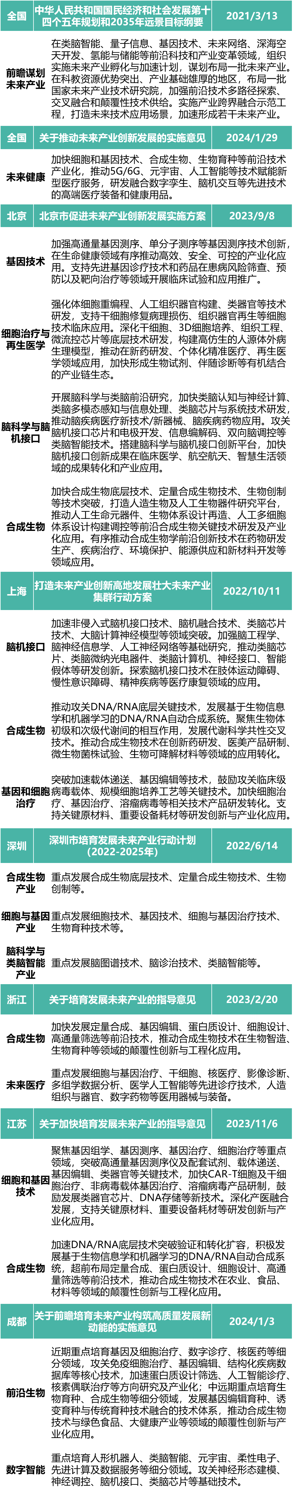 日前,工業和信息化部、教育部等七部門聯合印發《關于推動未來產業創新發展的實施意見》(工信部聯科〔2024〕12號),將“未來健康”作為未來產業布局的六大方向之一,明確要加快細胞和基因技術、合成生物、生物育種等前沿技術產業化,推動5G/6G、元宇宙、人工智能等技術賦能新型醫療服務,研發融合數字孿生、腦機交互等先進技術的高端醫療裝備和健康用品。近年來,國內多個省市也突出未來產業培育導向,加快細胞和基因治療、腦機接口、合成生物等生命科學和醫藥健康新賽道布局。本文綜合梳理各地已出臺的相關政策,結合生命科學和生物技術前沿方向,提出相關發展建議。