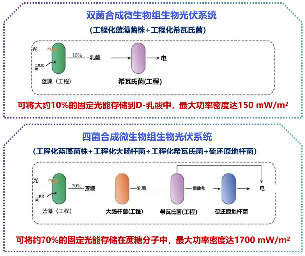圖4 雙菌、四菌合成微生物組生物光伏系統(tǒng)對(duì)比