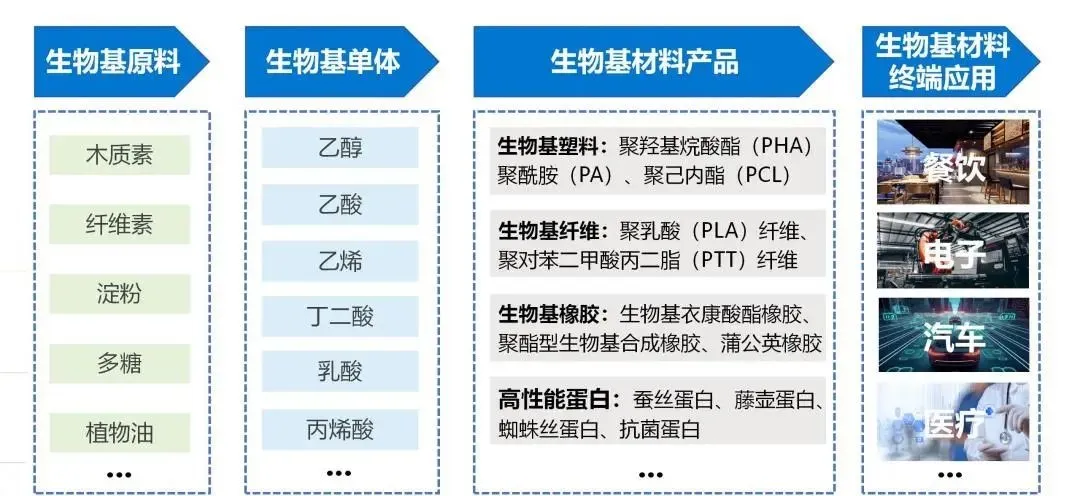 生物基材料已形成涵蓋“原料-單體-材料產品-終端應用”的新型材料產業鏈。原料層主要涉及生物質資源的收集、加工與轉化,生成植物油、木質素、纖維素、淀粉、多糖等原料。單體層重點是將上游原料經過生物合成、生物加工、生物煉制過程獲得生物醇、有機酸等生物基單體,以及乳酸、丁二酸等生物基平臺化合物,為生物基材料產品制備提供基礎。產品層重點是通過聚合反應和加工過程生產的各種生物基材料,如生物基塑料、生物基纖維、生物基橡膠等。終端應用層則是生物基材料產品的應用場景,涉及醫療、電子汽車、食品包裝、餐飲等多個領域。