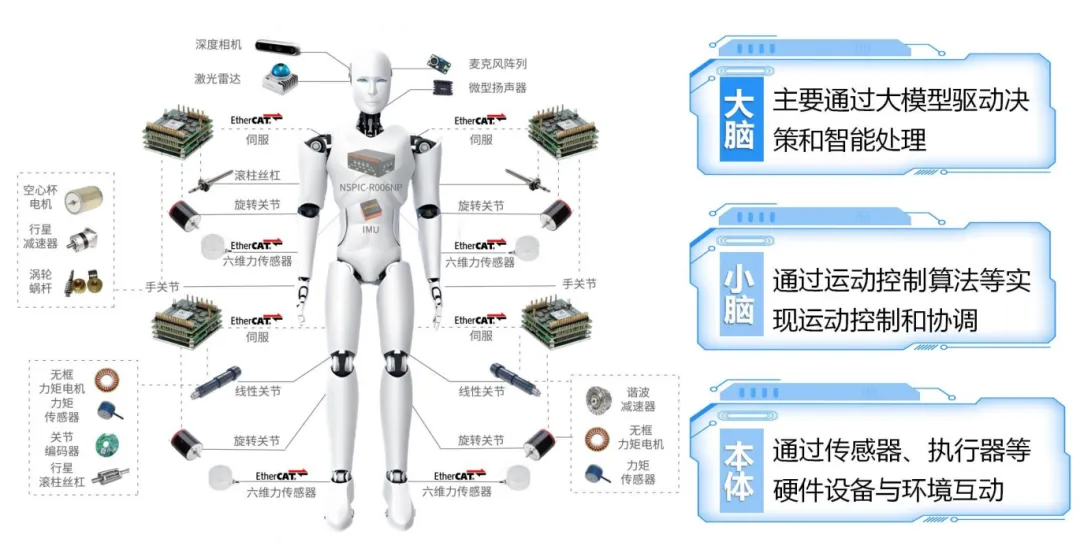 具身智能在架構(gòu)上可以分為“大腦”“小腦”和“本體”。依托三者協(xié)同配合,機器人才能像人類一樣去面對各項需求,完成各類任務(wù)。其中,“大腦”主要通過大模型驅(qū)動決策和智能處理;“小腦”通過運動控制算法等實現(xiàn)運動控制和協(xié)調(diào);“本體”通過傳感器、執(zhí)行器、靈巧手等硬件設(shè)備實現(xiàn)與環(huán)境互動。