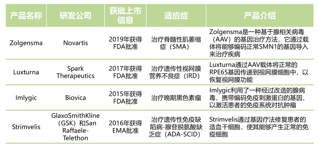 截至目前,合成生物技術(shù)在基因治療領(lǐng)域已有一些產(chǎn)品獲得了國(guó)外監(jiān)管機(jī)構(gòu)的批準(zhǔn),進(jìn)入了市場(chǎng)。