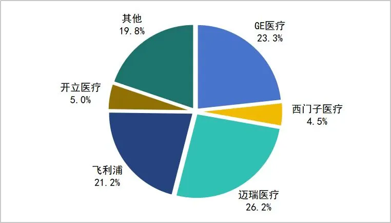 我國US市場規(guī)模約180億元,GE醫(yī)療(26%)、邁瑞醫(yī)療(24%)、飛利浦(24%)三家企業(yè)合計占據(jù)市場75%以上份額。隨著設(shè)備更新落地,國產(chǎn)品牌市場份額占比明顯提升,截至2024年三季度,US國產(chǎn)品牌占比提升至41%(邁瑞醫(yī)療26%、開立醫(yī)療5%,其他10%),GE醫(yī)療、飛利浦分別下降至23%、21%,預計2024年第四季度以及2025年上半年,隨著邁瑞醫(yī)療、開立醫(yī)療等企業(yè)參與更多設(shè)備更新采購,國產(chǎn)品牌市場份額將進一步快速提升。
