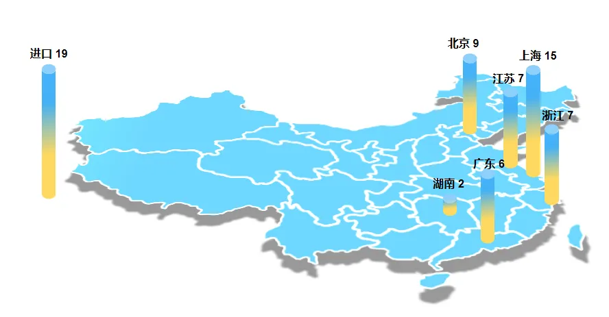 65款獲批產(chǎn)品中,本土46款(占71%)、進口19款(占29%),進口產(chǎn)品的比例首次升近三成,可見隨著我國創(chuàng)新醫(yī)療器械審批制度不斷與國際接軌,創(chuàng)新醫(yī)療器械市場日益融入全球。本土品種上,上海共獲批15款創(chuàng)新醫(yī)療器械,位居全國第一,領(lǐng)先北京9款,兩地獲批產(chǎn)品數(shù)量合計占比從2023年的33%攀升至2024年37%。進口品種上,美國國際引領(lǐng)地位更加突出,獲批數(shù)量(17個)占比近9成,遠高于2023年的6成;另有德國、日本各1個獲批在國內(nèi)上市。